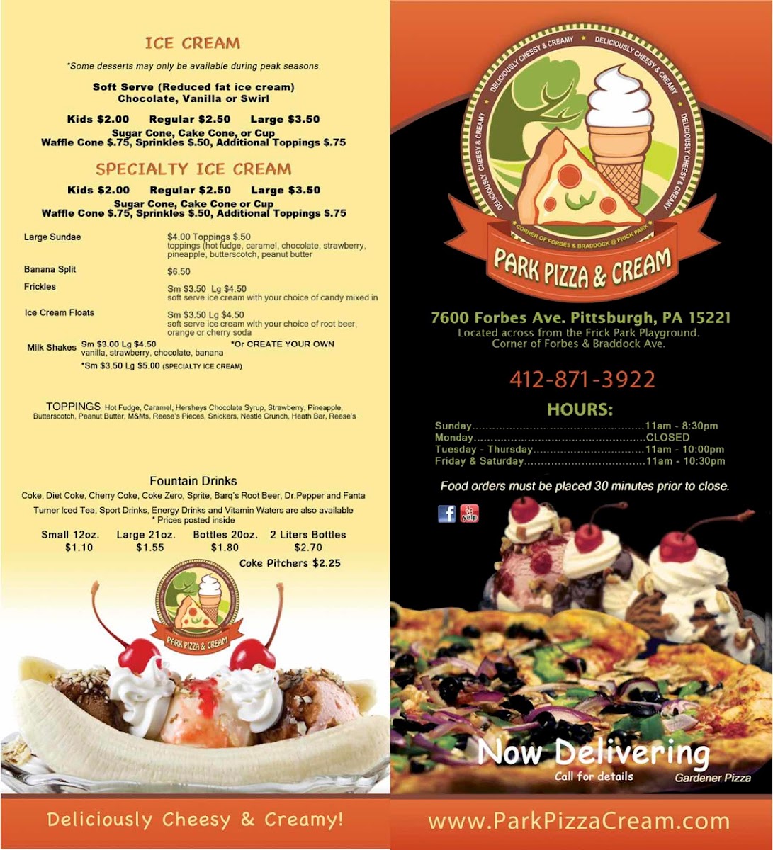 Located in the heart of Pittsburgh, Park Pizza & Cream offers a mouthwatering blend of pizzas and delightful desserts, just steps from Frick Park. The menu showcases a variety of options, starting with their New York Style Pizzas featuring a thin crust, tangy tomato sauce, and gooey mozzarella. Diners can enjoy specialty pies like the Buffalo Chicken Pizza, drizzled with ranch dressing, or the vibrant Gardener Pizza, abundant with fresh veggies.
